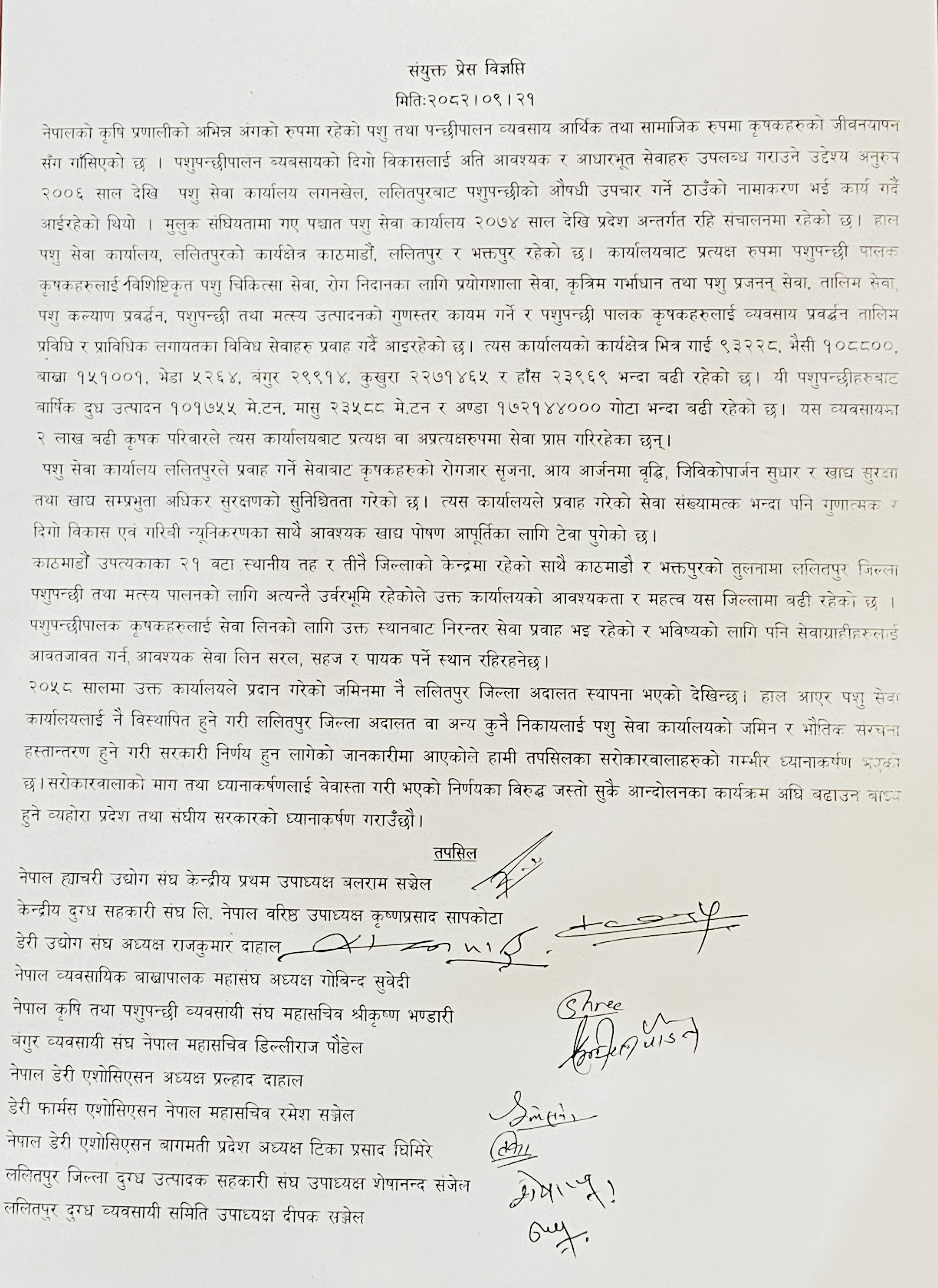 त्यस्तै, नेपाल ह्याचरी उद्योग संघका केन्द्रीय प्रथम उपाध्यक्ष बलराम सन्जेल, केन्द्रीय दुग्ध सहकारी संघ नेपालका उपाध्यक्ष कृष्णप्रसाद सापकोटा र बङ्गुर व्यवसायी संघका महासचिव डिल्लीराज पौडेलले कृषकहरुका लागि सहज र पायक पर्ने स्थानमा रहेको सेवा केन्द्र हटाउँदा पशु स्वास्थ्य र उत्पादनमा गम्भीर संकट आउने बताए ।नेपाल व्यावसायिक बाख्रापालक महासंघ, नेपाल कृषि तथा पशुपन्छी व्यवसायी संघ र नेपाल डेरी एशोसिएसनलगायतका ११ वटा संस्थाका प्रतिनिधिहरूले संयुक्त प्रेस विज्ञप्ति जारी गर्दै सरकारी निर्णयको विरुद्ध ऐक्यवद्धता जनाएका छन् । विज्ञप्तिमा भनिएको छ,‘हाम्रो मागलाई बेवास्ता गरी जर्बजस्ती निर्णय लादिएमा हामी जस्तोसुकै आन्दोलनका कार्यक्रम अघि बढाउन बाध्य हुने छौँ ।’ व्यवसायीहरूले यस विषयमा प्रदेश र संघीय सरकारको गम्भीर ध्यानाकर्षण गराउँदै कृषि र पशुपालनको आधार स्तम्भ मानिने यस्ता संरचना जोगाउन माग गरेका छन् ।