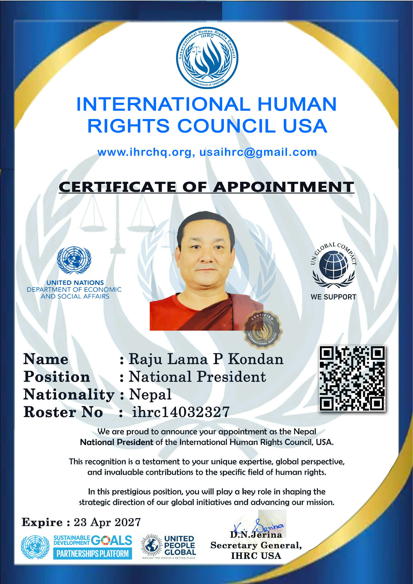 काठमाडौं । सामाजिक तथा मानवअधिकार क्षेत्रमा सक्रिय शान्तिवादी नेता भिक्षु राजु लामा कोन्दन अन्तर्राष्ट्रिय संस्था अन्तर्राष्ट्रिय मानवअधिकार परिषद् (अमेरिका) (International Human Rights Council USA) को नेपालका लागि राष्ट्रिय अध्यक्ष (National President) पदमा नियुक्त भएका छन्।