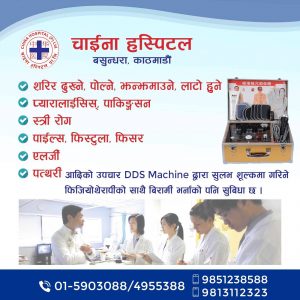 काठमाण्डौ, मंसिर २८ -चाइना हस्पिटल काठमाण्डौले नयाँ शैलीमा २०६५ सालदेखि परम्परागत चाइनिज बिधीद्धारा प्यारालाइसिस,पार्किसन, पत्थरी,पाइल्स फिस्टुला, महिलाहरुको समस्या,हड्डी तथा नशा रोग साथै छाला सम्बन्धी रोगहरु अत्यन्तै सर्बसुलभ दरमा उपचार गर्दै आएको छ । उपचारमा चाइनिज परम्परागत पद्दति साथै स्थानीय जडिबुडिको प्रयोग गर्दै आएको यस अस्पतालले २०७२ सालदेखि निशुल्क तालिम तथा हेल्थ क्याम्प पनि संचालन गर्दै आएको छ। हालसम्ममा अस्पतालले स्याङ्जा, म्याग्दी, सिन्धुपाल्चोकका दुर्गम स्थानहरुमा सेवा पुर्याउदै आएको छ भने गाउँघरमा पाइने स्थानिय जडीबुडीको फाइदा र उपयोगिताबारे पनि सिकाउदै आएको छ ।