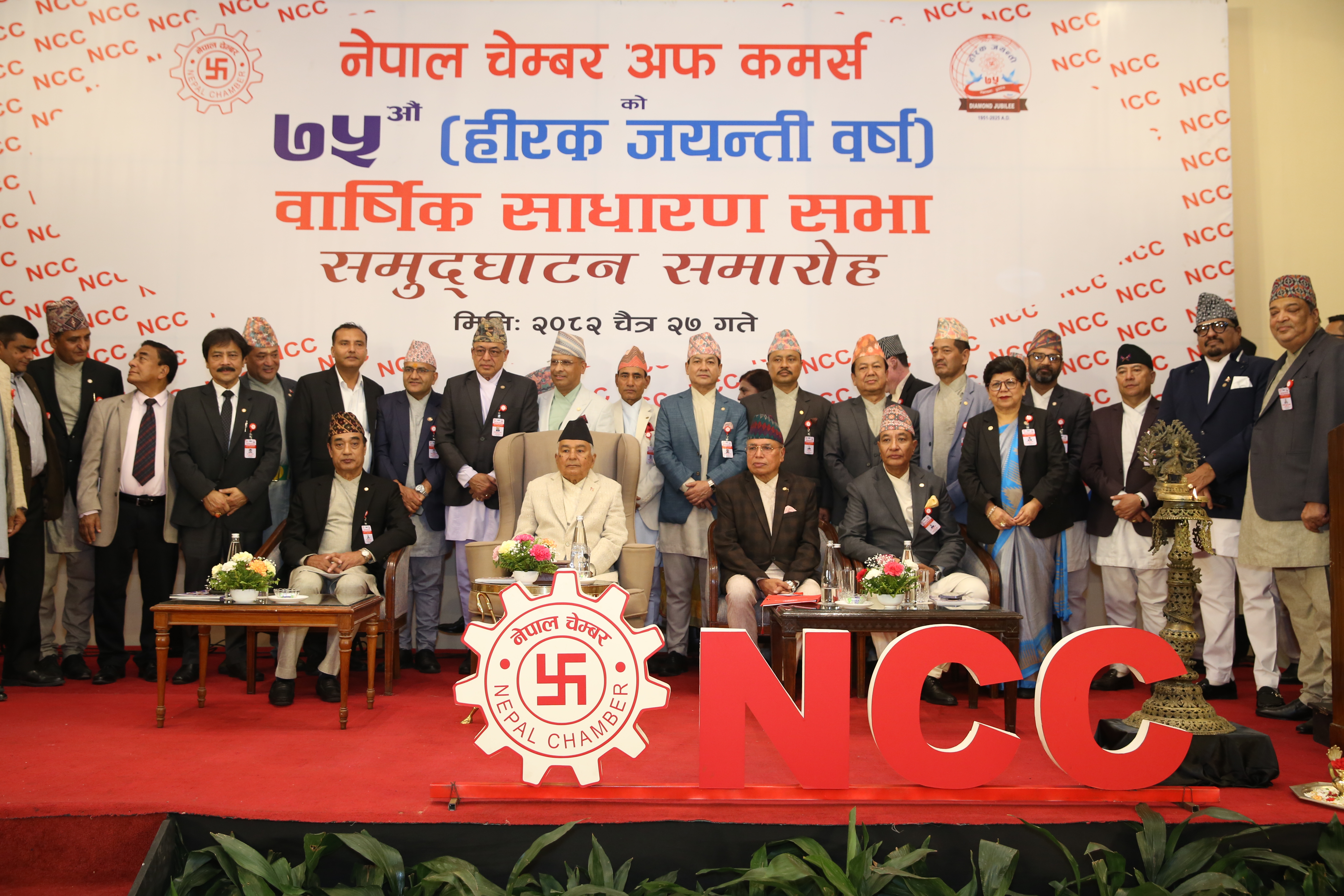 काठमाडौँ । राष्ट्रपति रामचन्द्र पौडेलले नेपाल चेम्बर अफ कमर्सको ७५औँ वार्षिक साधारण सभाको समुद्घाटन गरेका छन् । हीरक जयन्ती वर्षको अवसरमा आयोजित उक्त कार्यक्रममा आर्थिक तथा सामाजिक क्षेत्रमा उल्लेखनीय योगदान पु¥याउने ९ जना तथा संस्थालाई विभिन्न विधामा सम्मान गरिएको छ ।